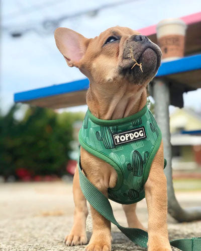 A neck adjustable dog harness featuring a unique TopDog design, printed onto soft neoprene fabric for comfort and style.